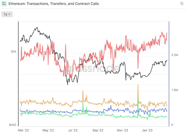 这可以部分解释为密码价格的上涨。但以ETH计价的TVL从年初的3,100万增至约3,230万。与此同时,尽管以太坊网络上的ETH交易的数量和容量在过去一年中几乎停滞不前,但所谓的内部智能合约调用(从已经执行的智能合约中发起的调用)的数量在最近几个月一直呈上升趋势,这表明网络智能合约活动正在增加。