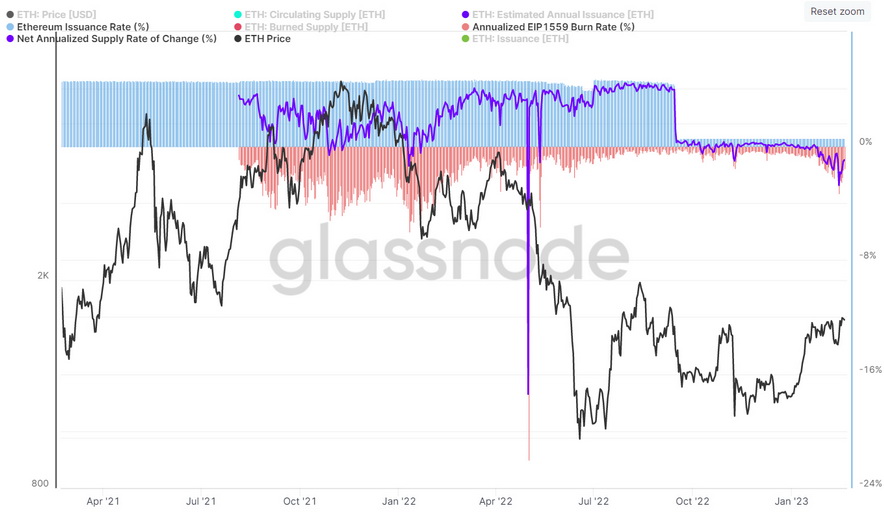 当时,以太坊区块链仍然由更加能源密集型的工作证明共识机制提供动力,由于为网络提供动力的矿工产生了更高的能源费用和矿工钻机成本,以太坊的发行率更高,约为每年4.4-4.6%。这意味着,乙醚的紧缩率仅触及1.5%左右的最高值。