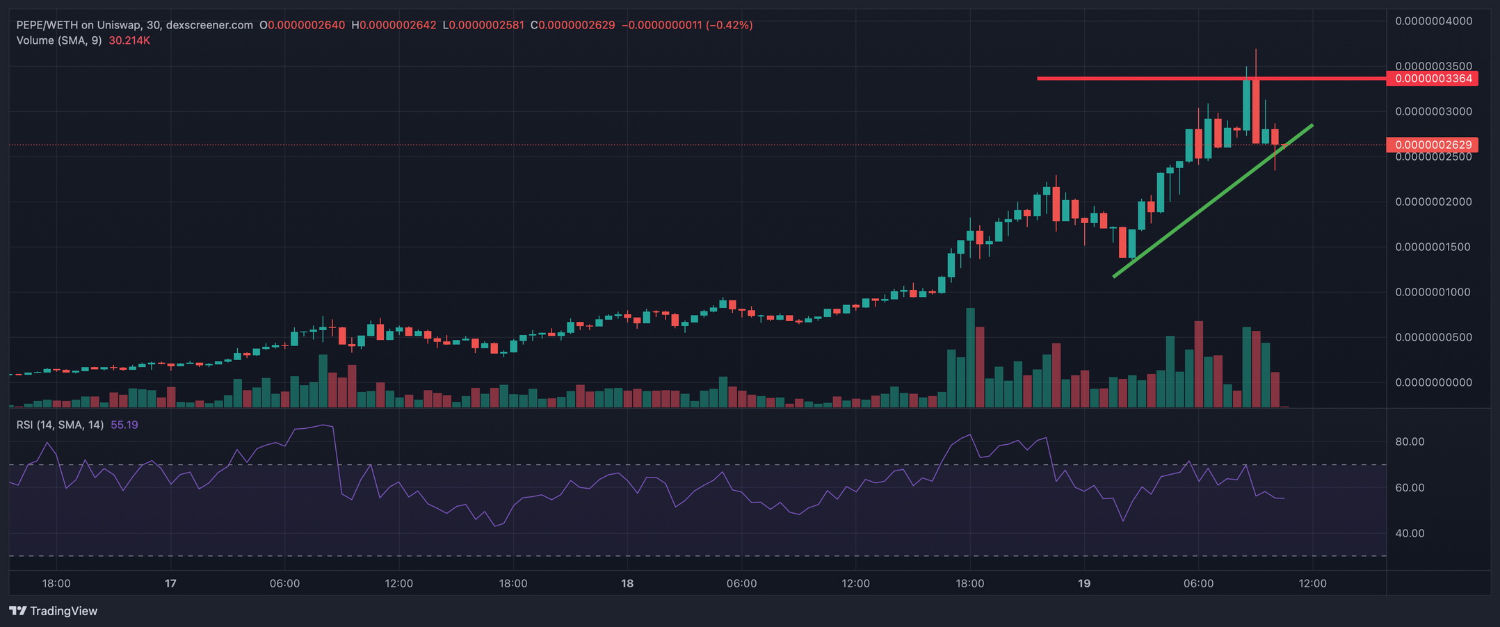 随着PEPE价格自上周末推出以来如此强劲地上涨,很明显,许多交易者正在买入这种代币,即使除了其表面的病毒式传播之外,它没有真正的基本面。