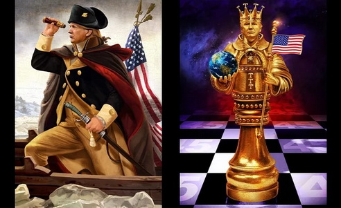 此外,他被描绘成一个美国爱国者和黄金王棋人物,一只手抓住世界,另一只手抓住美国国旗。
