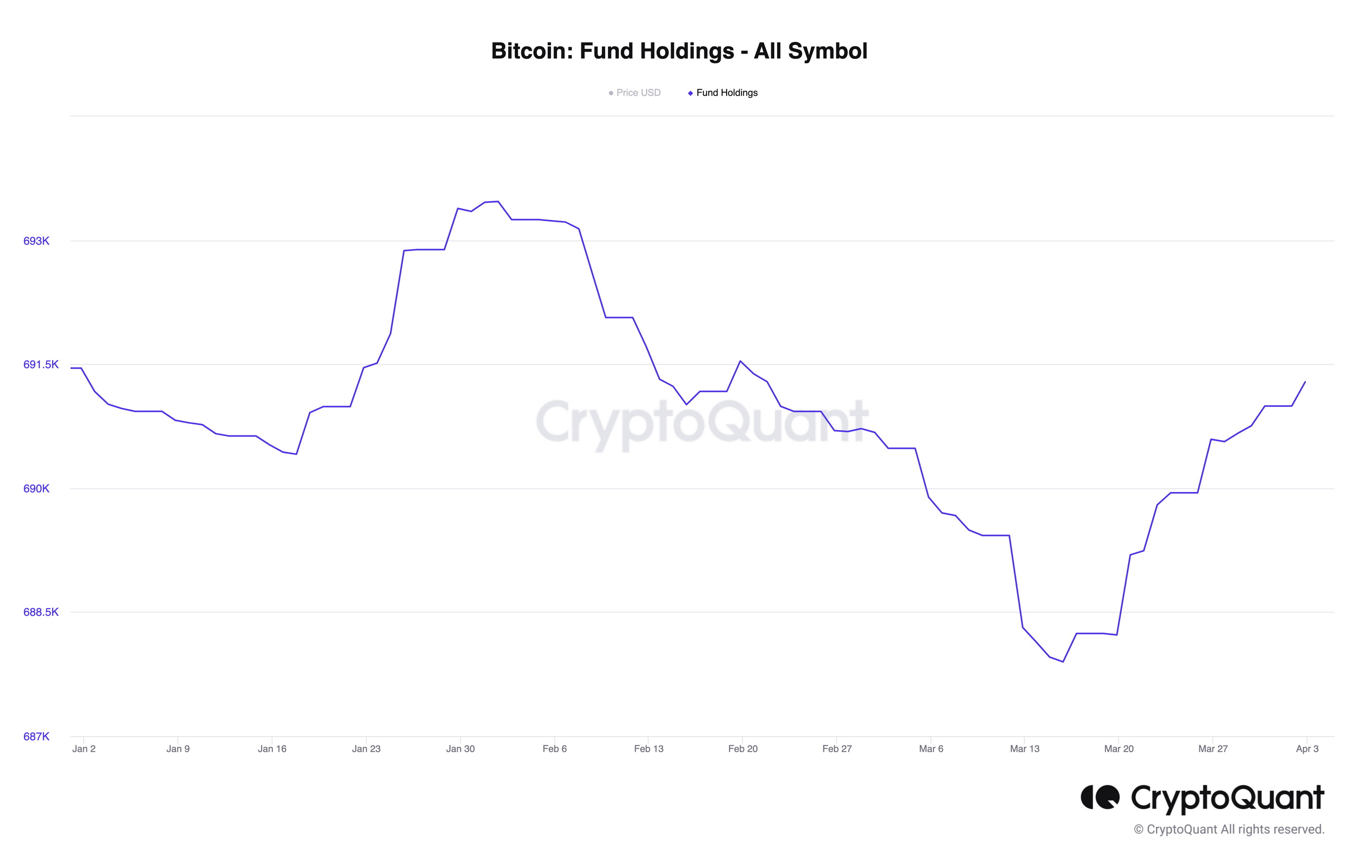根据CryptoQuant的数据,截至周日,基金持有量为692,000 BTC(按当前价格计算价值约200亿美元),高于3月14日的约688,000 BTC。