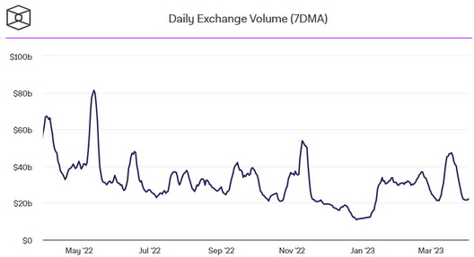 事实上,根据Block提供的数据,截至周一,七天移动平均交易量约为225亿美元,低于3月中旬的约460亿美元。