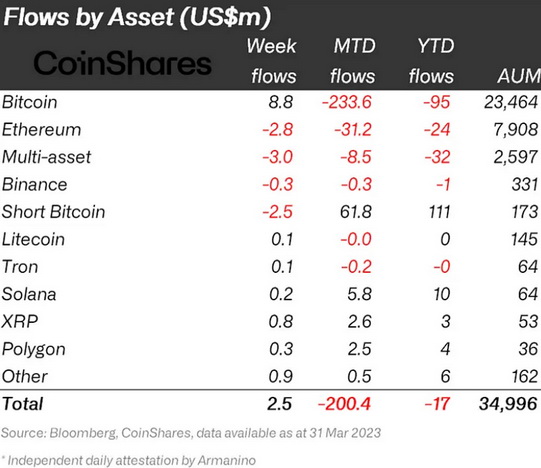 根据加密数据分析公司的数据,数字资产投资产品的总流入量为250万美元,与前一周相比,投资产品的交易量下降了33%。