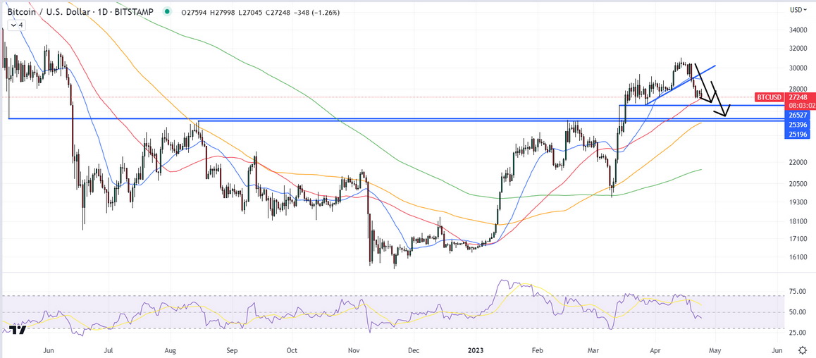 价格预测27000美元支撑能守住吗?自3月末/4月初的上升趋势和上周的21日均线被打破以来,许多技术人员一直在关注对26,500美元区域的支撑转阻力的重新测试,这一测试尚未实现。
