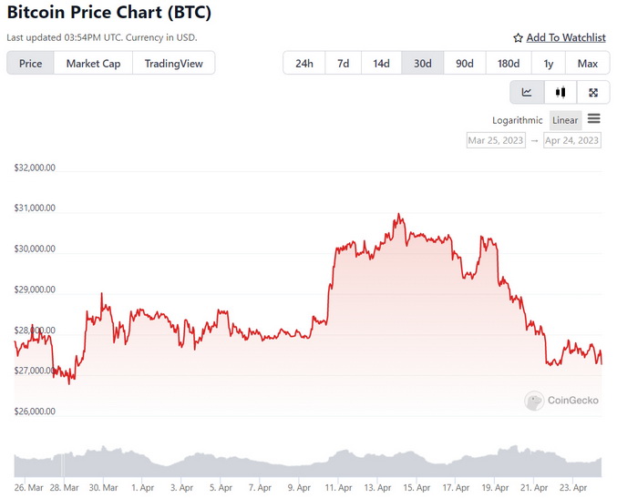 BTC价格上周下跌9%,目前水平比本月早些时候触及的10个月高点31,000美元低12%左右。