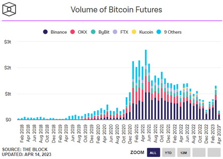 根据加密分析网站The Block提供的数据,截至4月中旬,比特币期货交易量本月迄今仅达到约3500亿美元。