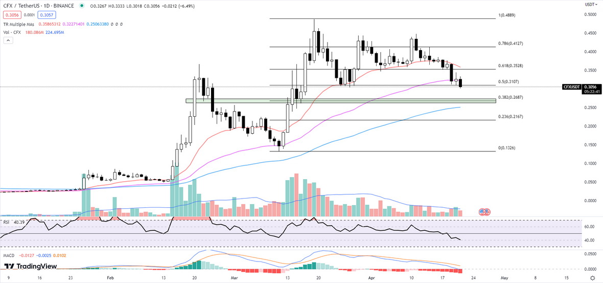 CFX’s has now broken through the support at the Fibonacci 0.5 level of $0.3107. The next potential support may be found at the Fibonacci 0.382 level of $0.2687, which is in confluence with the horizontal support range of $0.2618 to $0.2733.