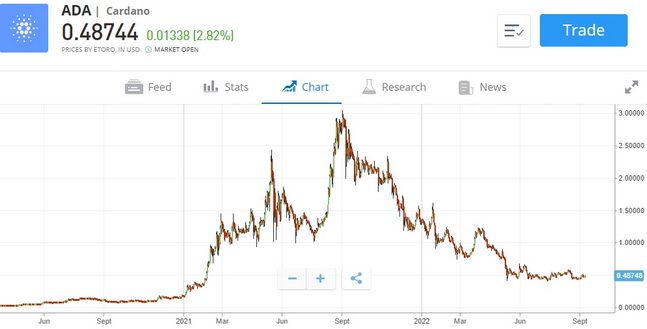 ADA was one of the few coins to surge with Bitcoin in 2021. Investors who bought ADA at the end of 2020 received more than 2,000% returns by September 2021. Since setting an all-time high (ATH), Cardano has lost 87% of its value but has recovered slightly.