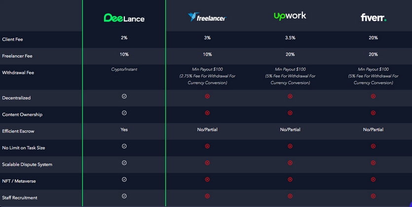 DeeLance is different from other freelance platforms, as it offers crypto payments and very low commissions. Compared to major platforms like Upwork, which charge a freelancer fee of 20%, DeeLance only takes a 10% cut. Furthermore, the client fee is set at only 2%.