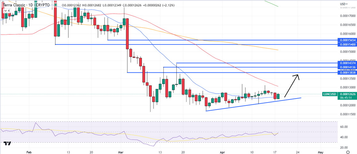 月神经典。来源:AdobeLuna Classic (LUNC),这种加密货币为现在基本上已不存在的原始区块链提供动力,自去年3月以来一直处于技术上升趋势,预示着未来可能的价格上涨。因此,价格预测有些乐观,至少在短期内是如此。