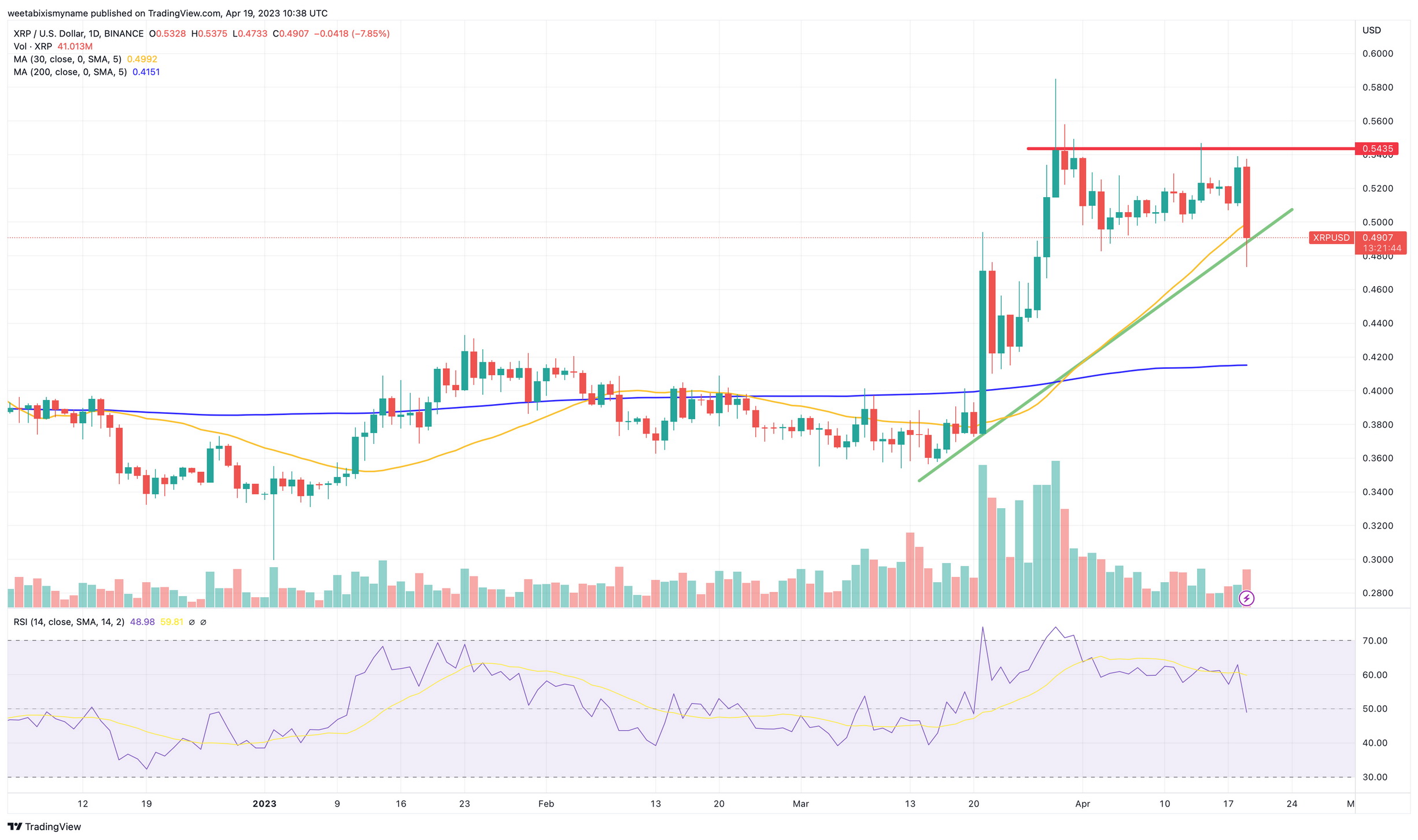 与此同时,XRP的相对实力指数(紫色)从4月初的70下降到今天的略低于50,有迹象表明它可能会进一步下降。