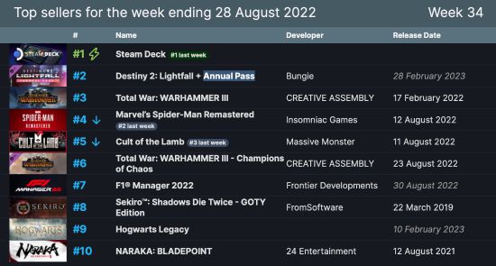 Steam公布了上周(截至28日)销量排行榜,V社掌机Steam Deck十三连冠,《漫威蜘蛛侠:重制版》跌至第四名,《只狼:影逝二度》第八名,《霍格沃茨之遗》第九名。