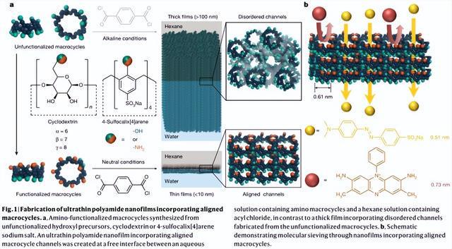 挑战在于将多孔材料有序排列,使其内部孔洞对齐,以提供直的亚纳米渗流通道。在这里,作者将氨基功能化的大环排列在超薄纳米膜中,以创建明确的亚纳米孔,用于有机溶剂纳滤(OSN)中的精确分子筛分。通过选择性地将环糊精和4-sulfocalix[4]芳烃钠盐(SC[4]A)的上(窄)边上的伯羟基功能化,合成氨基功能化的大环,而下(宽)边不变(图1a)。核磁共振(NMR)和傅里叶变换红外(FTIR)光谱证实了它们的形成。由于长而灵活的聚氨酯键减少了分子内的氢键,这些氨基功能化的大环在中性条件下在水中表现出良好的溶解度。当与酰氯(例如对苯二甲酰氯,TPC)在自由界面聚合时,具有高活性胺的上环优先向上进入发生交联反应的有机相,而不具有活性的下环向下进入水溶液。然后,大环通过交联的超薄纳米膜优先排列,形成明确的亚纳米通道,可以为尺寸差低至0.2 nm的溶质提供精确的分子筛分(图1b)。相比之下,其它合成路线生产不溶于水的衍生物,需要碱性条件。这将使下边缘的羟基去质子化,并引发交联反应,随机填充大环。