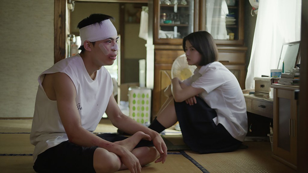 When Ujie finds his desk chair missing one day, he gets physically rough with another student, who says he had nothing to do with it. Before he can seriously hurt the much smaller boy, Mai gently embraces him, clearly recognizing another damaged spirit. Later, he confronts her over the intervention, sneeringly asking, “You think you’re Mother Teresa?” The bond between the two intensifies after Ujie is jumped and brutally beaten up by a gang of kids and Mai later shows up at his home and makes a surprising offer.